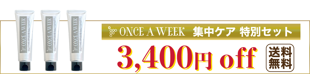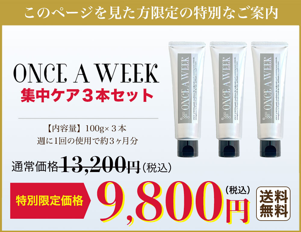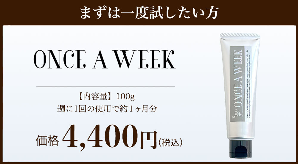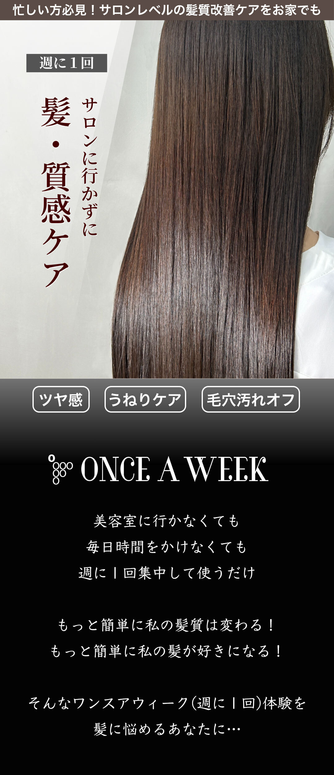 ONCE A WEEKはシャンプー・トリートメント・頭皮ケアの効果をたった1本のホームケアで体感できます。 頭皮から毛先までクリームを馴染ませた後、頭皮をやさしくマッサージしているだけで、その間に毛先までケア成分が行き届き頭皮〜毛先までのケアが完結します。 忙しい毎日を過ごされている方でも週に1回の使用で集中的に頭皮と髪のケアが可能です。